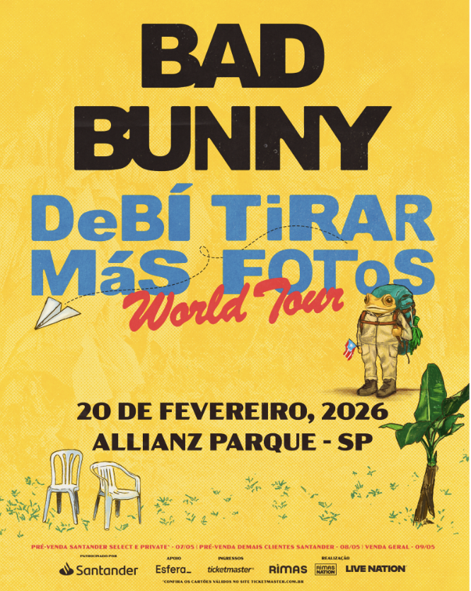 Após o sucesso de seu álbum aclamado pela crítica, o vencedor de três GRAMMY® e onze GRAMMY® Latino, Bad Bunny, anuncia oficialmente sua turnê mundial “DeBÍ TIRAR MáS FOToS”. A turnê de 23 datas em estádios começará na sexta-feira, 21 de novembro de 2025, em Santo Domingo, República Dominicana, com paradas na Costa Rica, Colômbia, México, Peru, Chile, Argentina, Brasil, Austrália, Japão, Espanha, Portugal, Alemanha, Holanda, Reino Unido, França, Suécia, Polônia e Itália, antes de terminar na Bélgica em 22 de julho de 2026. A apresentação do Brasil acontece no dia 20 de fevereiro de 2026, em São Paulo, no Allianz Parque. Os ingressos para o show no Brasil, realizado pela Live Nation e Rimas Nation, estarão à venda para o público geral na sexta-feira, 9 de maio, em www.ticketmaster.com.br. Haverá pré-venda para clientes Santander Select e Private no dia 7 de maio e pré-venda para demais clientes Santander no dia 8 de maio (mais informações abaixo).
