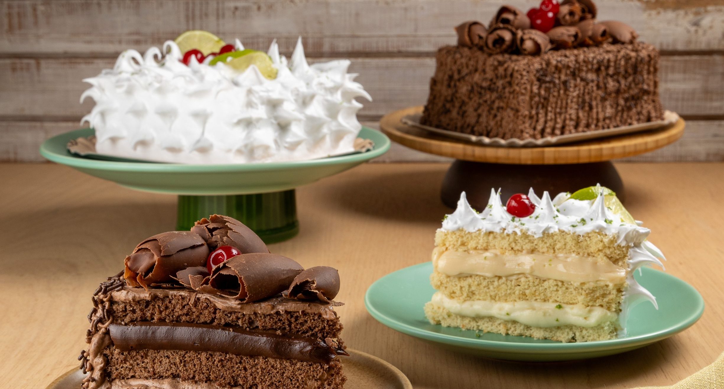 Já para quem busca um recheio leve e cítrico a pedida é o bolo Ganache de Limão#56. O bolo é feito com massa branca e recheado com creme gelado e ganache preparado com a fruta cítrica. Na cobertura, muito marshmallow, raspas de limão e cerejas dão o toque final.