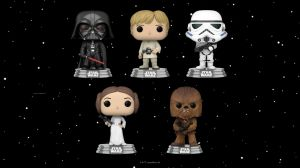 Entre os destaques estão figuras de Star Wars: Episódio IV – Uma Nova Esperança, incluindo os protagonistas Luke Skywalker, Princesa Leia e Chewbacca, além do emblemático Stormtrooper e o temido Darth Vader, retratado em um momento icônico de sua transformação em A Vingança dos Sith. As figuras, com cerca de 11 a 12 centímetros de altura, apresentam o tradicional design Funko com cabeça oscilante, característica marcante da marca.