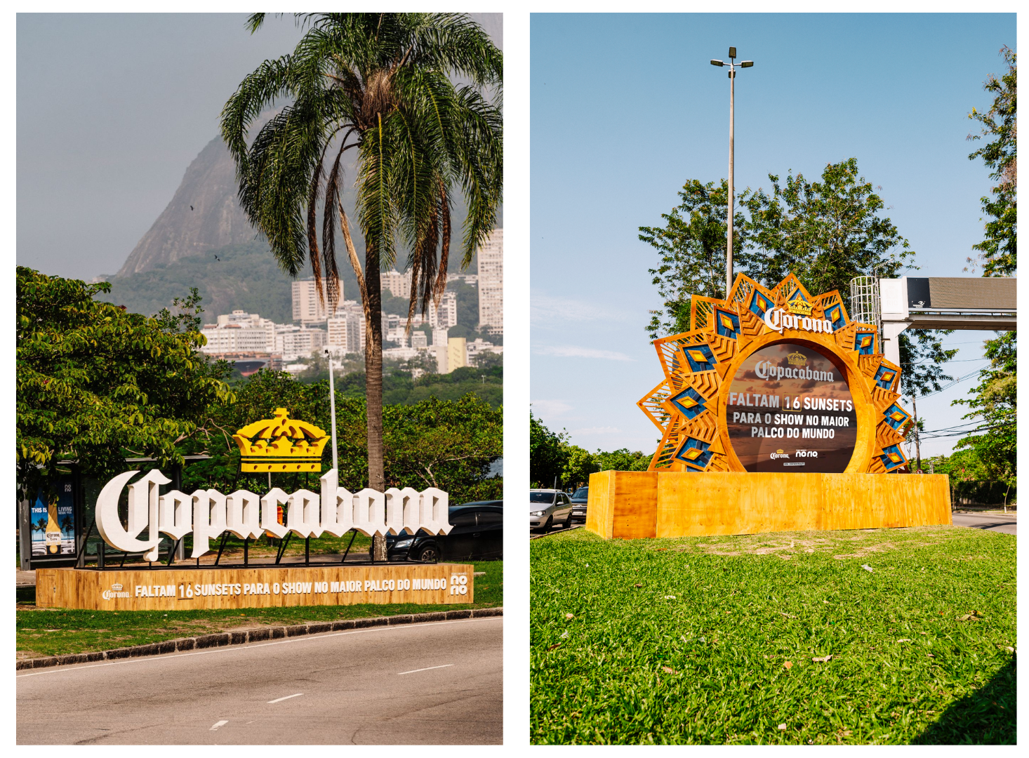 Já para celebrar a praia icônica que receberá esse grande espetáculo, Corona instalou dois letreiros em homenagem à Copacabana – o primeiro situado em um dos acessos ao bairro, no Corte do Cantagalo e o segundo na Avenida Borges de Medeiros, pouco depois da saída do Túnel Rebouças.