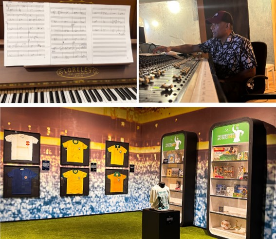 A exposição, sob curadoria de Marcelo Duarte, leva o público a uma viagem sensorial por 15 ambientes, onde a trajetória do eterno Camisa 10 é apresentada de forma documental e lúdica. A música de Marcelo Lima surge como um elemento essencial para reforçar a conexão emocional com os visitantes, oferecendo uma trilha marcante que remete às conquistas e à aura lendária do Rei Pelé.