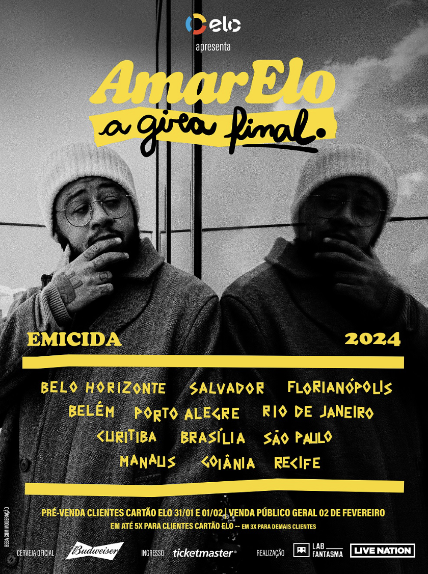 O trabalho lançado em 2019 (e eternizado em documentário da Netflix) teve as suas primeiras interpretações ao vivo no mesmo ano em que chegou ao mundo, porém precisaram ser abreviadas pela pandemia. De volta aos palcos, o repertório – um refúgio para muitos – ganhou dimensões imensuráveis. O espetáculo foi realizado 120 vezes, passou por 9 países e 55 cidades. E acabou se tornando uma espécie de culto para o público, tamanha a profundidade e intensidade da troca entre o artista e os seus fãs. Por isso, a despedida desta turnê não poderia ser como um corte seco. O cantor, compositor, rapper e pensador contemporâneo anuncia, então, AmarElo – A Gira Final, uma parceria da Laboratório Fantasma com a Live Nation Brasil que fará da experiência de AmarElo ao vivo algo ainda mais especial.