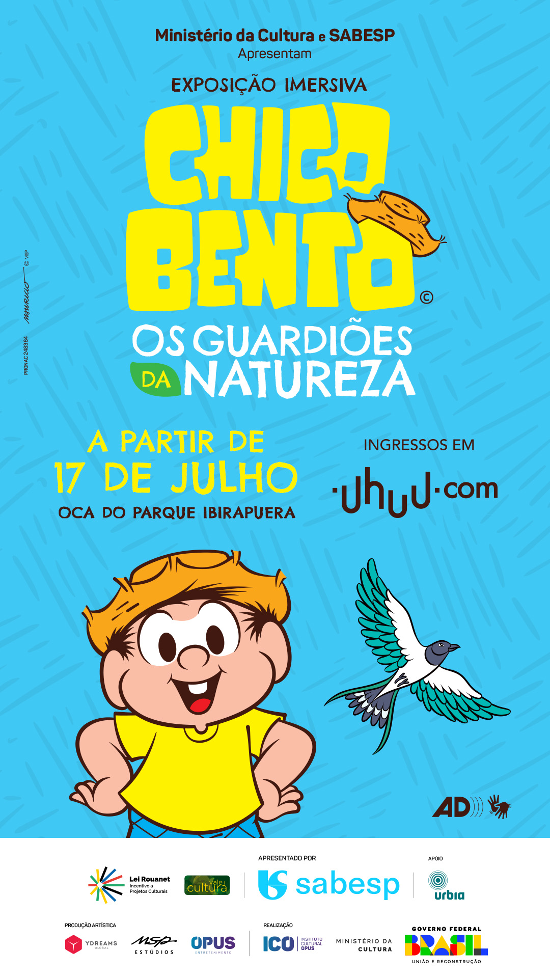 Entre os dias 17 de julho a 3 de agosto, Ministério da Cultura e Sabesp apresentam a exposição inédita “Chico Bento e os Guardiões da Natureza”, na Oca do Ibirapuera. A experiência interativa une educação, tecnologia e cidadania para conscientizar sobre a importância do saneamento e a preservação do meio ambiente. Voltada para toda a família e inspirada em um dos personagens mais carismáticos da MSP Estúdios, a mostra convida o público a mergulhar no ciclo do saneamento por meio de um percurso lúdico que busca inspirar uma nova geração de guardiões da natureza.