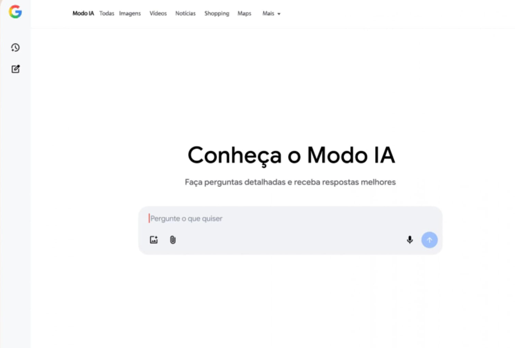 O Modo IA do Google, que havia sido anunciado em maio durante o evento Google I/O, agora chega ao Brasil com interface em português. A ferramenta utiliza o modelo Gemini 2.5 da empresa e aparece como uma nova aba no topo da página de busca, ao lado das opções tradicionais de “Imagens”, “Vídeos” e “Notícias”.