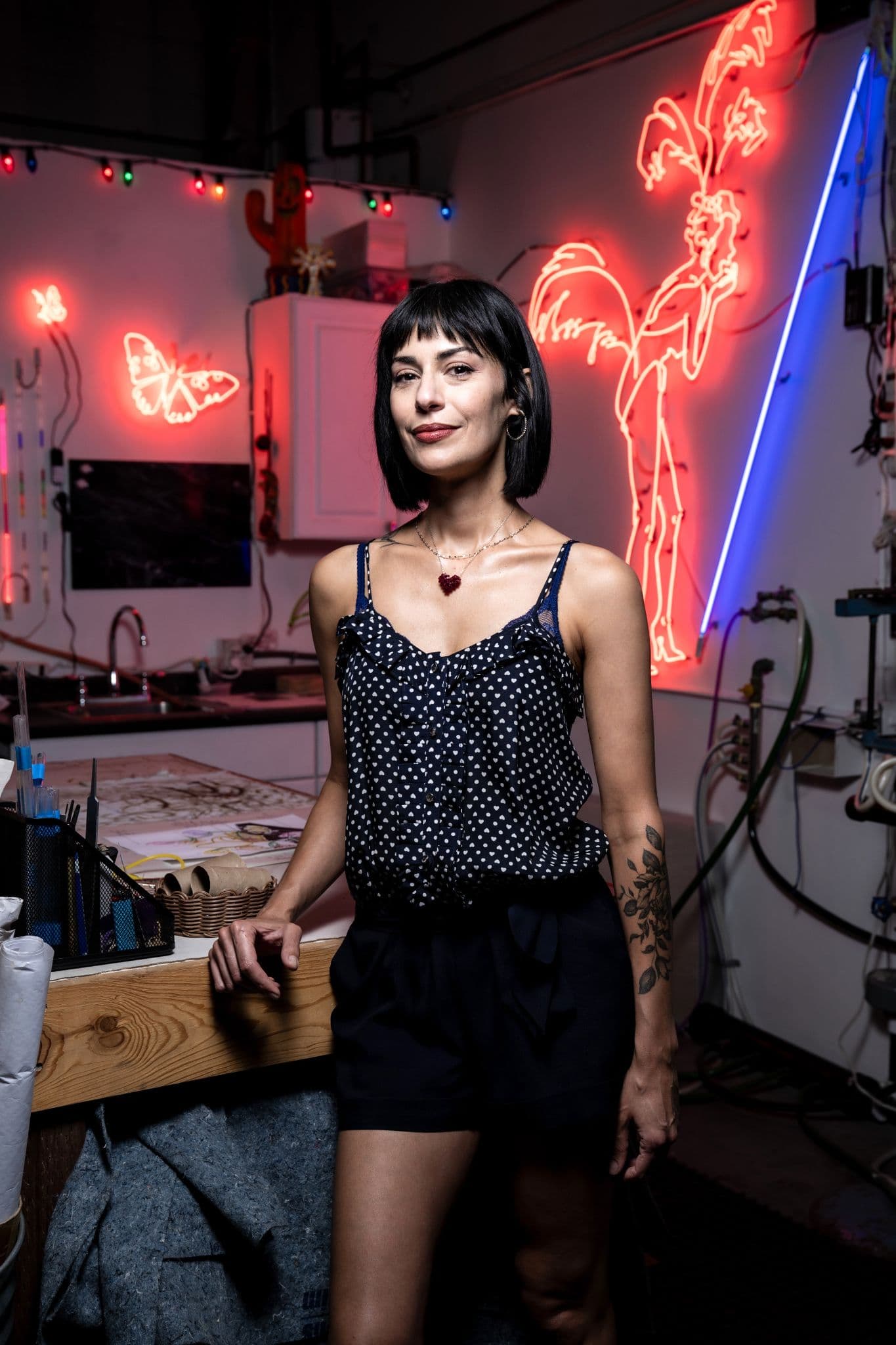 Leticia não é qualquer uma que acende letreiros. Crescida nos arredores desérticos de Las Vegas, a artista fez do brilho sua religião estética.
