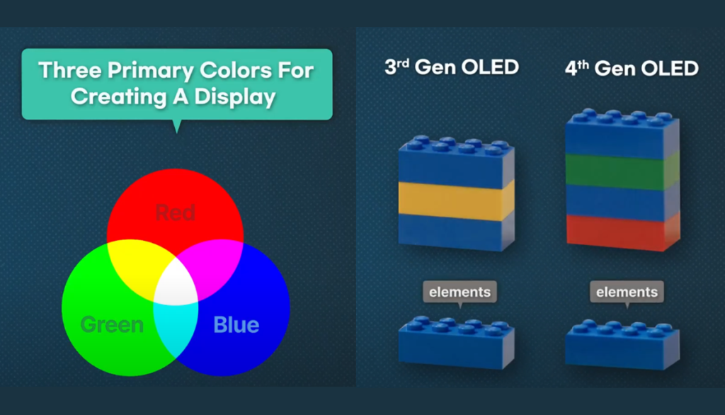 A inovação central da 4ª geração de OLED está na tecnologia Primary RGB Tandem. Enquanto a 3ª geração utilizava uma camada amarelo-esverdeada para representar as cores vermelha e verde, a nova geração substitui essa camada por camadas independentes para cada cor, totalizando quatro camadas (duas azuis, uma vermelha e uma verde). Isso permite uma reprodução de cores ainda mais precisa, vívida e intensa.