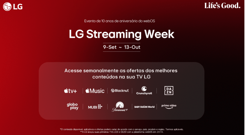 Parar comemorar junto com os consumidores o grande marco de 10 anos da plataforma webOS, a LG decidiu presentear usuários de TVs LG fabricadas entre 2018 e 2024 com promoções exclusivas nos streamings Apple Music, Apple TV+, Globoplay, Prime Video, Paramount +, Blacknut, Crunchyroll, Dazn, Mubi e Baby Shark World.