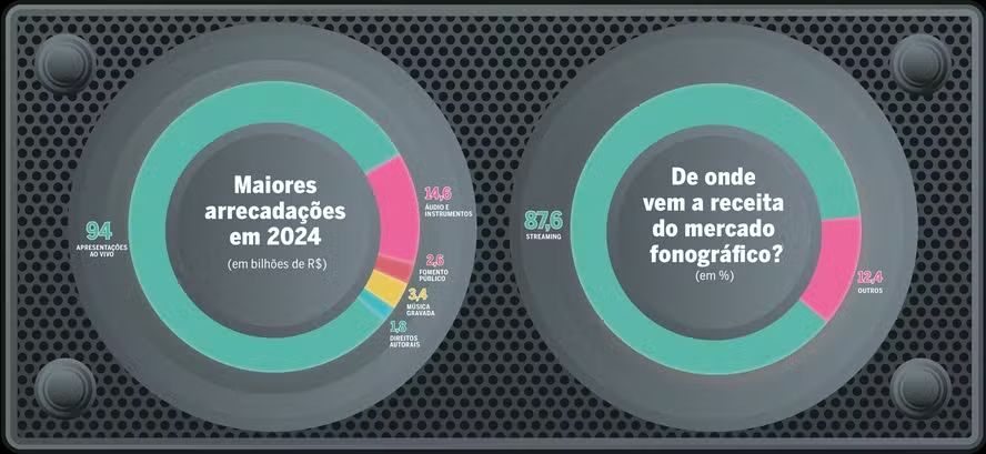 Já o segmento de música gravada movimentou R$3,5 bilhões, mas apenas R$700 milhões chegaram aos intérpretes e R$250 milhões aos compositores. A discrepância, destacada na matéria, revela um ponto crítico da indústria: embora os números sejam bilionários, a remuneração direta de quem cria e interpreta ainda está muito aquém do potencial.