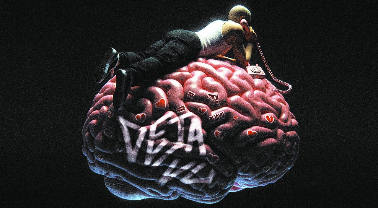 “Quando eu estava criando a capa, minha mente estava focada em algo que representasse a persistência de um pensamento, algo que ficasse sempre presente. A ideia central era um cérebro, simbolizando essa ideia, conectado a um telefone em 3D, comigo deitado sobre ele. O Erick contribuiu com sua estética única, unindo-a à minha visão original. O resultado foi um cérebro cheio de corações, transmitindo visualmente a emoção da música de forma poderosa e moderna.”, declara Rique.