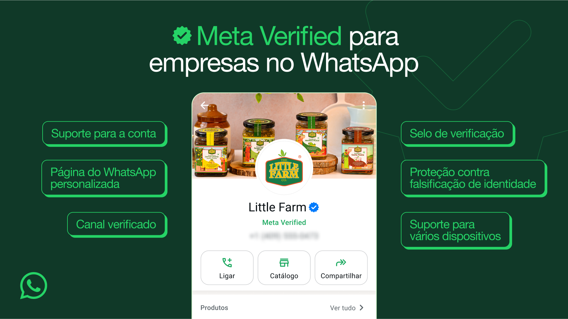 Também estamos começando a implementar o Meta Verified no aplicativo WhatsApp Business no Brasil, Índia, Indonésia e Colômbia. Quando você vê um selo Meta Verified, isso significa que uma empresa registrou suas informações na Meta. As empresas que usam o Meta Verified recebem suporte de conta aprimorado (incluindo proteção contra falsificação de identidade) e podem usar o WhatsApp em vários dispositivos para seus funcionários.
