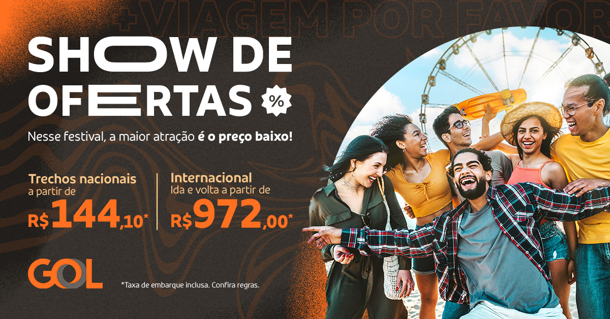 Foi dada a largada para os grandes festivais de música. Para atender a este e outros motivos que possam demandar uma viagem às pressas ou programada com antecedência, dentro do Brasil ou para o exterior, a GOL Linhas Aéreas disponibiliza neste fim de semana o seu Show de Ofertas. Trechos domésticos saem a partir de R$ 144,10 na promoção e viagens internacionais de ida e volta, a partir de R$ 972. O período de vendas do Show de Ofertas tem início às 18h desta sexta-feira (22) e segue até às 23h59 de domingo (24).