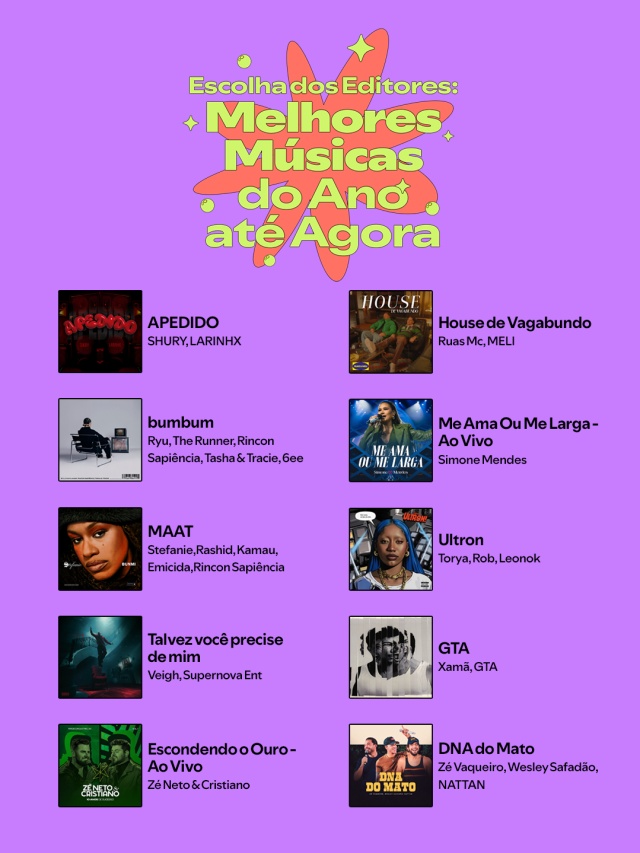 A playlist Escolha dos Editores: Melhores do Ano Até Agora reflete esse processo e oferece um recorte representativo da música brasileira em 2025 até o momento, destacando tanto artistas consolidados quanto nomes em ascensão. O resultado? Uma seleção com recorte plural e dinâmico: hits conhecidos, sons em ascensão e apostas ousadas, passando por funk, rap, pop, sertanejo, MPB, piseiro, trap e muito mais. Uma escuta ampla e editorial que mapeia, em tempo real, a produção musical brasileira.