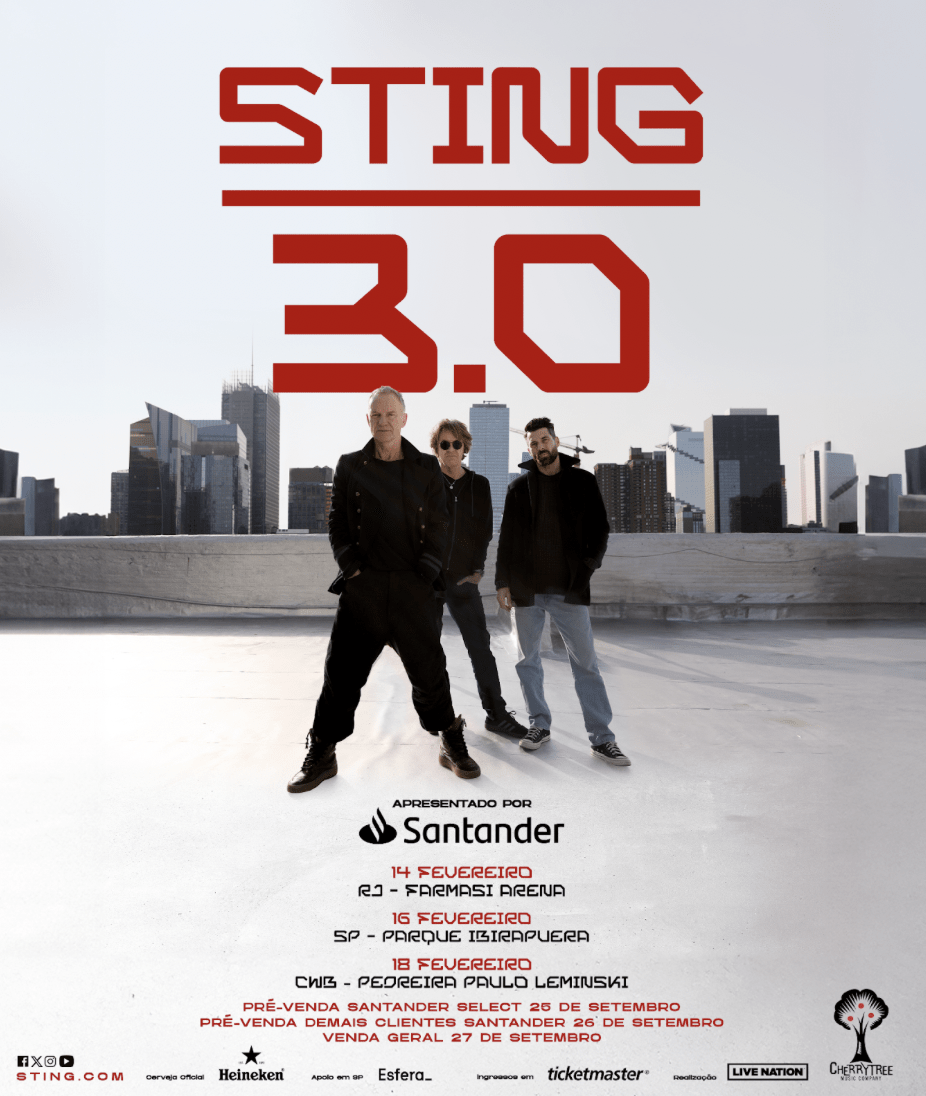 STING, vencedor de 17 prêmios Grammy, continua a todo vapor com a turnê “STING 3.0”. Acompanhado do guitarrista virtuoso e colaborador de longa data, Dominic Miller, e do baterista dinâmico Chris Maas (Mumford & Sons, Maggie Rogers), Sting apresentará os sucessos mais eletrizantes de sua discografia atemporal pela América Latina no ano que vem, incluindo três datas no Brasil: no dia 14 de fevereiro de 2025, no Rio de Janeiro, Farmasi Arena; dia 16 de fevereiro em São Paulo, no Parque Ibirapuera e no dia 18 de fevereiro em Curitiba, na Pedreira Paulo Leminski.
