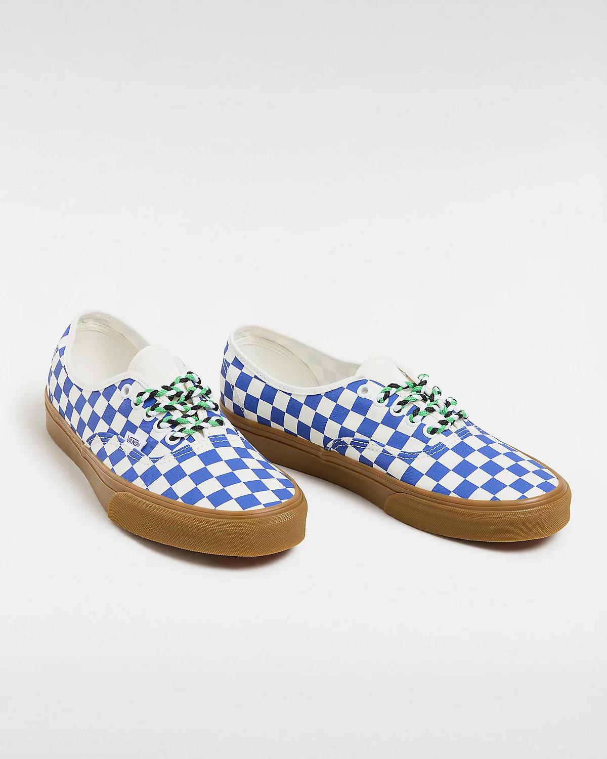 Com seu design clássico de cano baixo e tecido de lona resistente, o Authentic oferece uma tela em branco para a individualidade e criatividade, agora com uma ênfase no famoso padrão checkerboard na colorway CHECKERBOARD BLUE/WHITE e cadarços trançados em verde. A sola waffle de borracha natural, que definiu a diferenciação da Vans desde seus primeiros dias, continua a ser uma característica distintiva, oferecendo aderência e durabilidade incomparáveis.